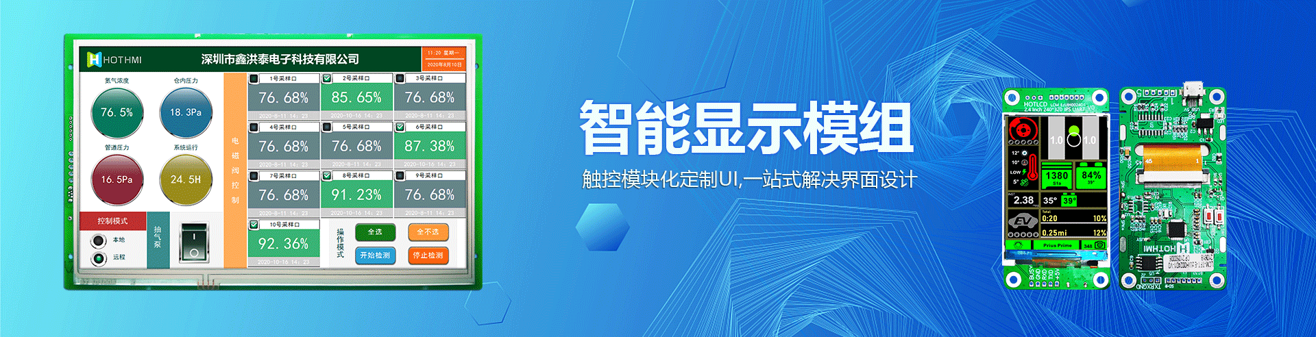 鑫洪泰EzUI系列智能液晶顯示模塊,即:E(easy容易的)、z(zero零代碼)、UI(用戶界面)。 EzUILet 系列模塊最大的特色為使用簡(jiǎn)便、功能豐富,用戶對(duì)其使用可簡(jiǎn)可繁。用戶可以使用界面開(kāi)發(fā)工具軟件(EzUITool)進(jìn)行人機(jī)界面的設(shè)計(jì)、編輯、控件配置、響應(yīng)設(shè)置等,將工具軟件生成的資源文件復(fù)制到 EzUILet 系列模塊之中,便可達(dá)成所需人機(jī)交互界面的設(shè)計(jì)制作,而無(wú)需用戶單片機(jī)或其它控制器的編程控制。而為滿足有特殊要求的用戶,EzUILet 系列模塊還保留有大部分顯示控制指令,以便于用戶可以更自由的對(duì)模塊顯示進(jìn)行控制。 EzUILet系列與 EzUI 系列:EzUILet系列模塊由 EzUI 系列模塊衍生,也屬于 EzUI 系列模塊;相對(duì)EzUI 系列模塊,EzUILet系列精簡(jiǎn)了部分控件的屬性,并且將模塊 USB 設(shè)備接口改為虛擬串口,資源文件的寫(xiě)入方式與原 EzUI 系列不同;EzUILet 系列模塊還將資源存儲(chǔ)器的容量降低,使之更合理,可靠性更好。EzUILet系列當(dāng)中的無(wú)觸摸版本需要用戶 MCU發(fā)送按鍵消息,并由這些按鍵消息觸發(fā)模塊內(nèi)部 GUI系統(tǒng)的事件,這點(diǎn)與帶觸摸的 EzUI 系列模塊是最大的不同之處。EzUILet 系列模塊的 GUI 系統(tǒng)當(dāng)中各個(gè)控件的命名仍使用 EzUI 系列模塊的命名。