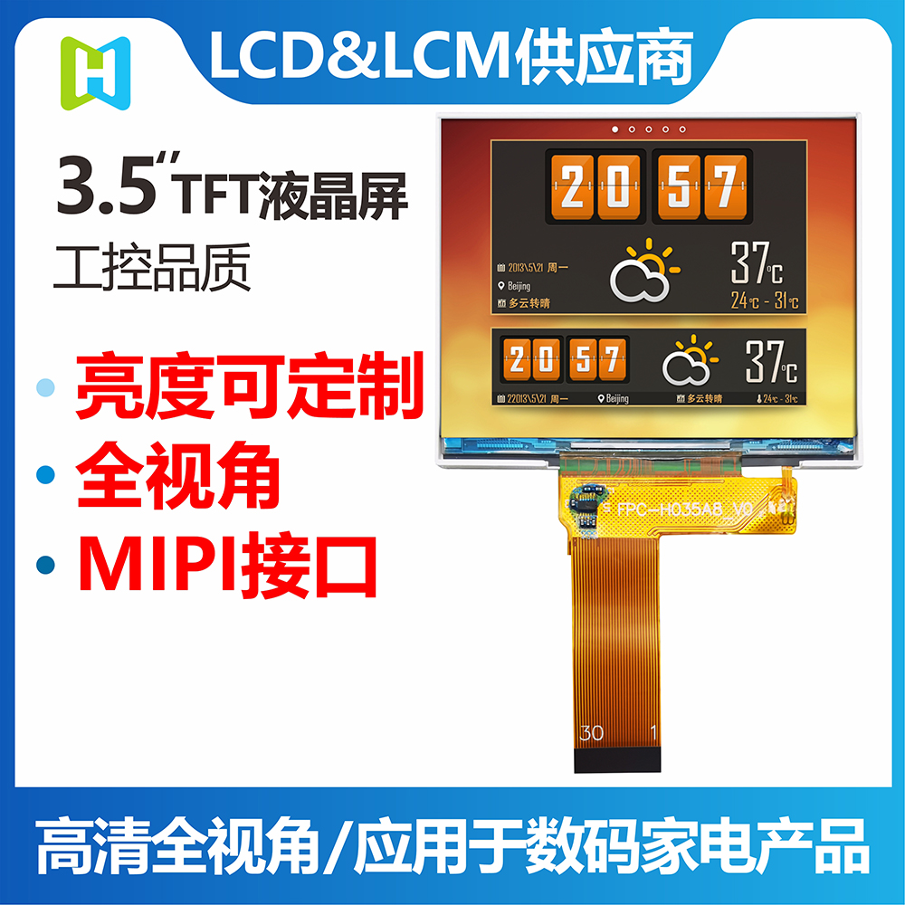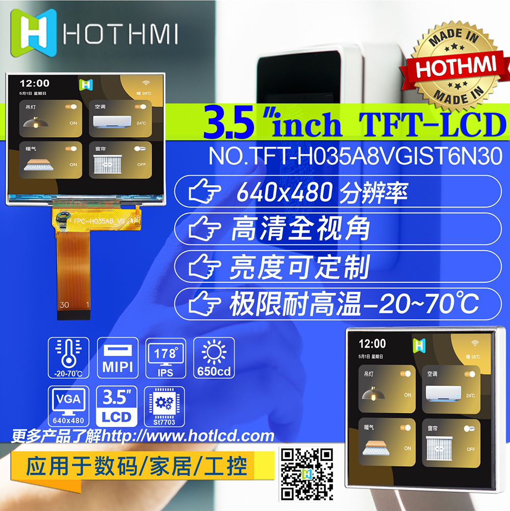 產(chǎn)品說明 TFT-H035A8VGIST6N30 是一款 3.5 英寸全彩 TFT LCD 模塊,分辨率為 640x480 像素,縱橫比為 1.25:1。 TFT模塊采用ST7703驅(qū)動(dòng)IC,支持MIPI接口。 采用IPS面板的TFT模組具有廣視角優(yōu)勢(shì)(左80度/右80度/上80度/下80度),典型對(duì)比度800:1,模組亮度高達(dá)650尼特 (典型值)。 模塊工作溫度范圍-20℃~+70℃,儲(chǔ)存溫度范圍-30℃~+80℃。