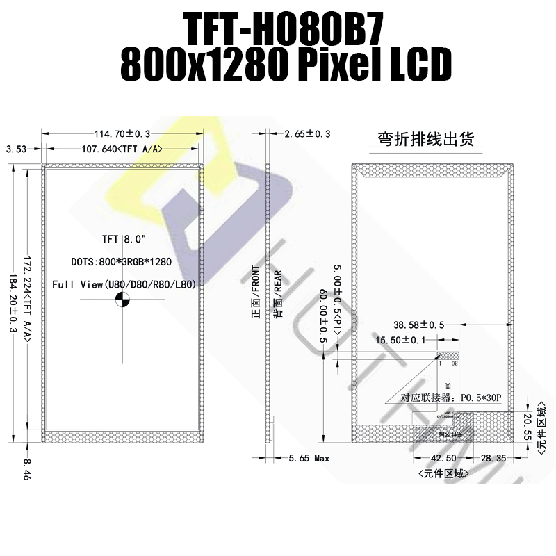 • 型號: 8.0寸TFT彩屏|高清800*1280分辨率|全視角IPS工藝|MIPI 接口|TFT-H080B7HDINV6N31