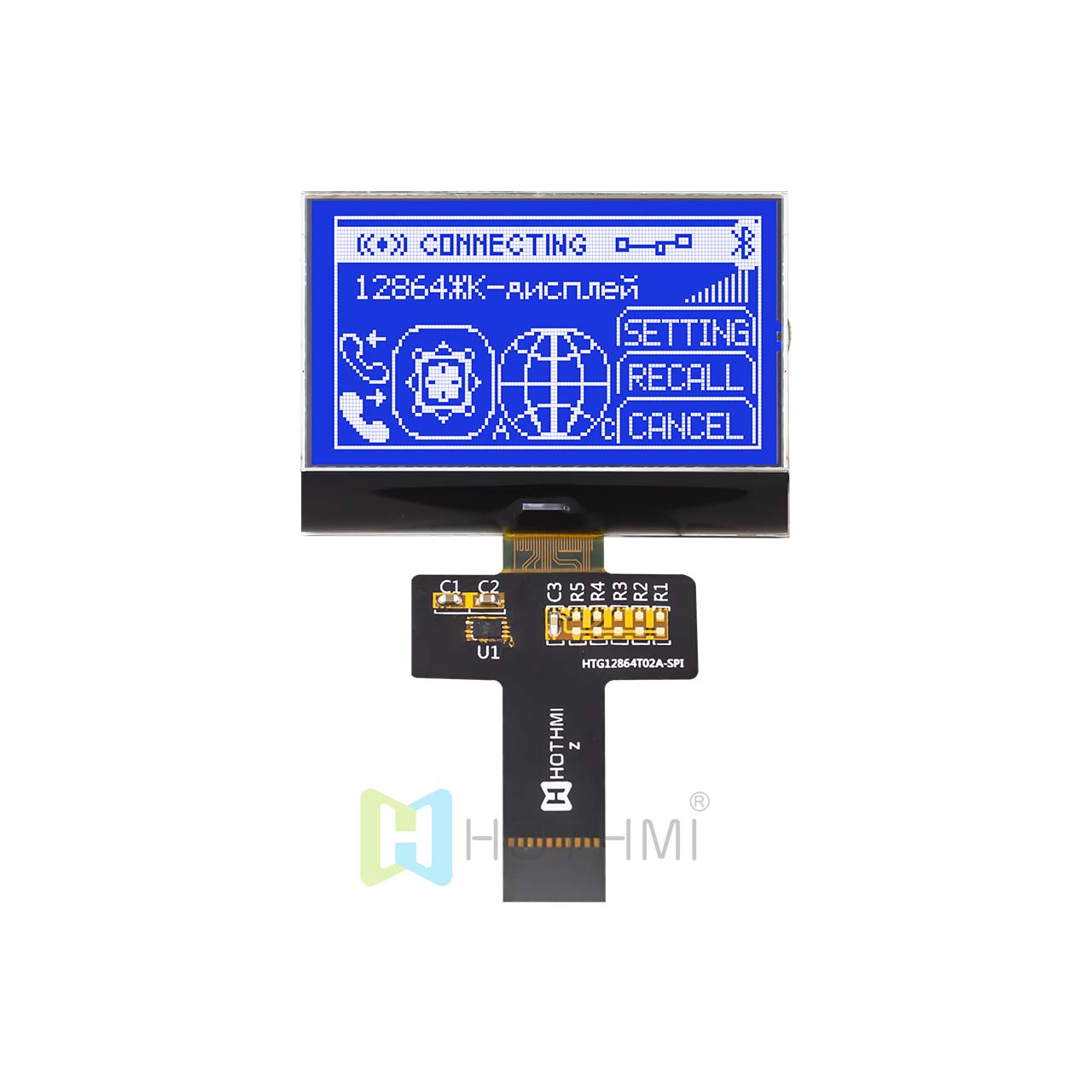 2.2 英寸 128x64 圖形 COG | STN+ | 灰底藍字 | SPI | ST7567 | Arduino HTG12864T02A-11W--SPI-FONT COG 128x64 53.2x37.8x2.8 49.2x27.0 40.92x24.28 0.38x0.32 6H FPC-10PIN SPI 防靜電ESD 8KV -20~70℃ +3.3 V ST7567