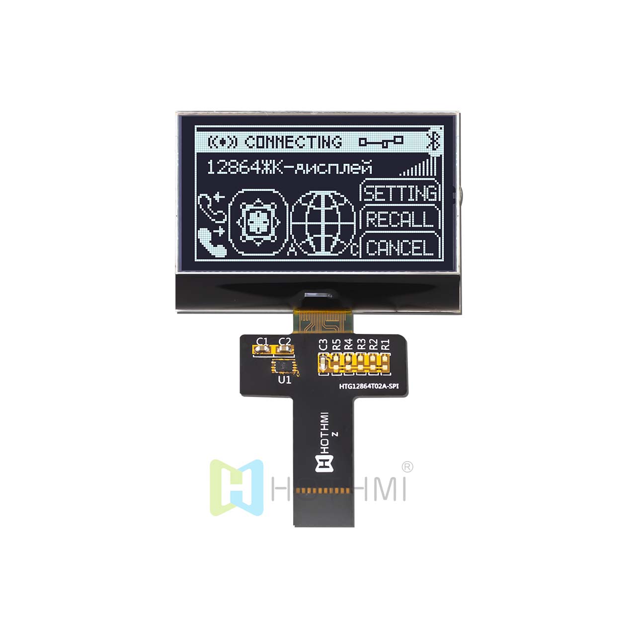 2.2 英寸 128x64 圖形 COG | FSTN+ | 紅綠藍背光 | SPI | ST7567 | Arduino HTG12864T02A-35S--SPI-FONT COG 128x64 53.2x37.8x2.8 49.2x27.0 40.92x24.28 0.38x0.32 6H FPC-10PIN SPI 防靜電ESD 8KV -20~70℃ +3.3 V ST7567