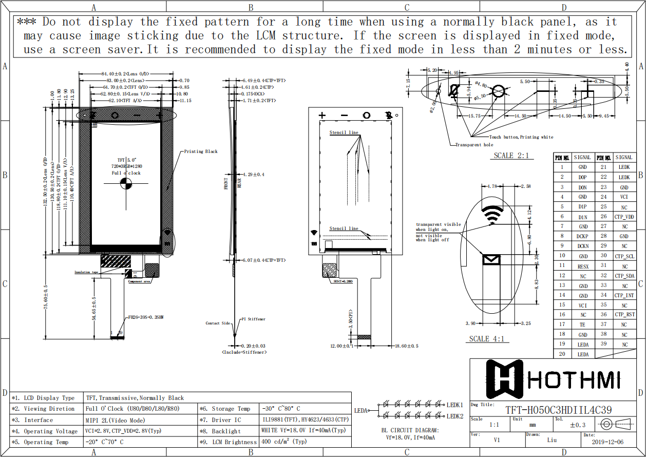 71.04x129.56 | 5.5 | 5.5 | 67.932x120.768 | 全視角 | 1000 cd/m2 | 30pin | MIPI | 可帶電容觸摸屏 | -20~70℃ | 3.3V | ILI9881 | |