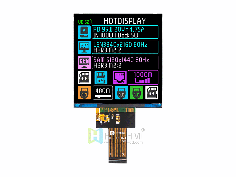 | 4寸彩色高清液晶顯示模塊IPS 720X720點(diǎn)陣彩屏模組 NV3052 RGB 陽光下可見 TFT-H040A20DKINV 6N40 | TFT方屏 | 720x720 |